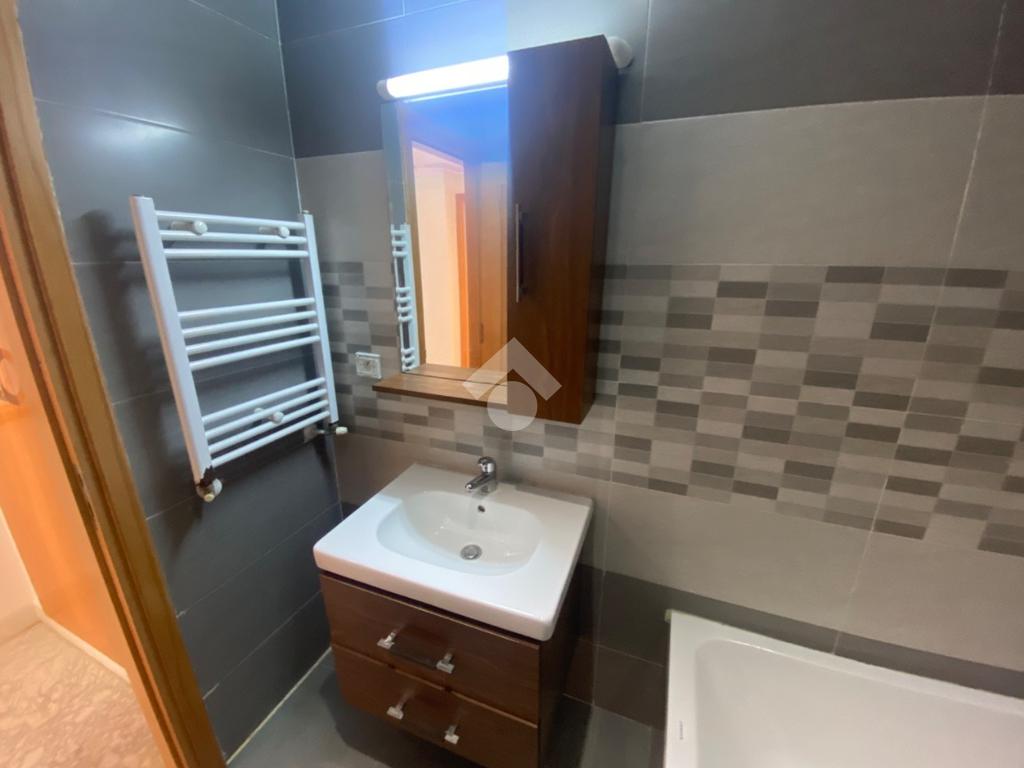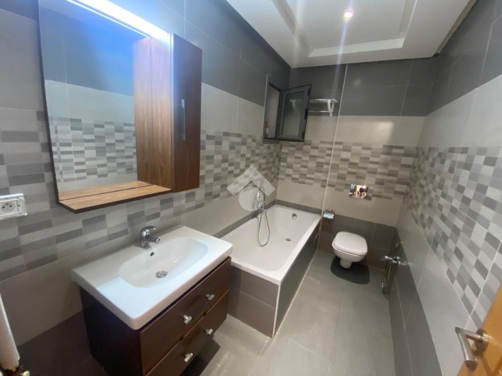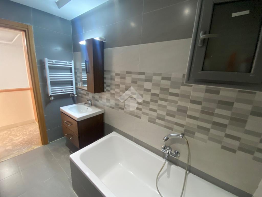 La salle de bain, spacieuse, est dotée d’une baignoire et de rangements intégrés, alliant confort et fonctionnalité.